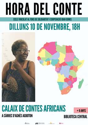 "La narradora Agnès Agboton ens proposa una sessió de contes africans especialment adreçada a infants a partir de 6 anys. Narracions que ens parlen del perquè i del com de les coses des d'una saviesa ancestral però, alhora, molt propera i divertida.