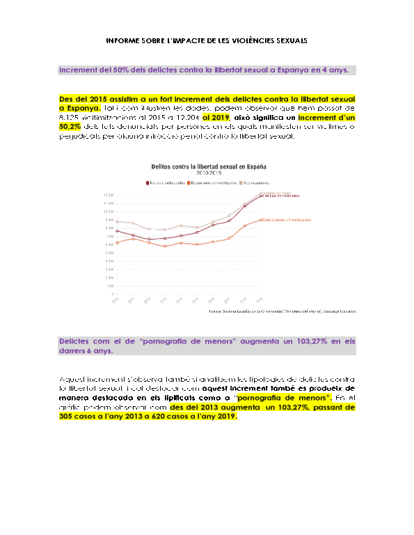 Les violències sexuals que pateixen tant les dones com les nenes i els nens d’arreu de l’Estat s’han incrementat de forma considerable en els darrers anys. Els delictes contra la llibertat sexual han augmentat un 52 % en els darrers 4 anys i delictes com el de pornografia infantil han patit un augment de més del 100 %.
