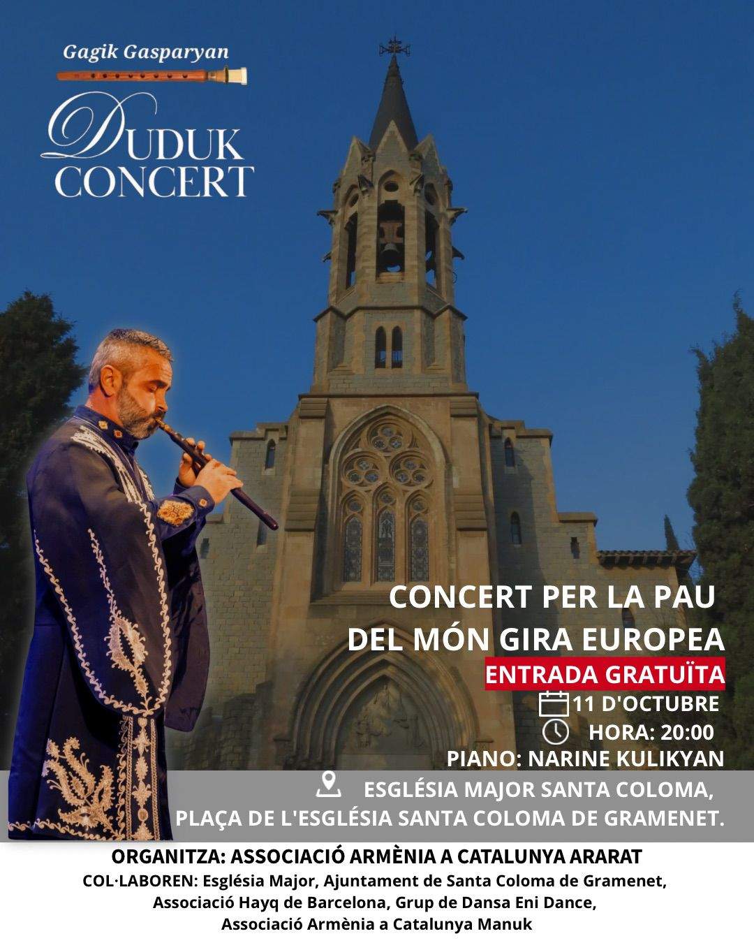 Santa Coloma de Gramenet se suma a la gira per Europa des d’Argentina del mestre de duduk Gagik Gasparyan acompanyat per la pianista Narine Kulikyan de la mà de l’associació Armènia a Catalunya-Ararat. El duduk és un instrument espiritual de vent de 3.500 anys d’antiguitat i d’origen armeni. Els Concerts per la Pau són un projecte nascut l’any 2024 que vol sensibilitzar de la importància de la pau a través de la interpretació de música sagrada d’Armènia.