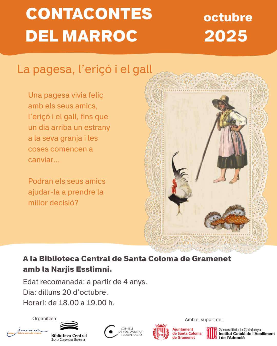 La història d’aquesta tarda posa en valor l’amistat i que ser petit no vol dir ser feble. Novament, Narjis Esslimni, narradora oral experta en contes àrabs, ens fa conèixer la rica tradició oral de la literatura marroquina, on els halaigi (els contacontes) han tingut una importància cabdal en la transmissió cultural. Una activitat que posa de manifest la riquesa de la diversitat cultural a les nostres ciutats.