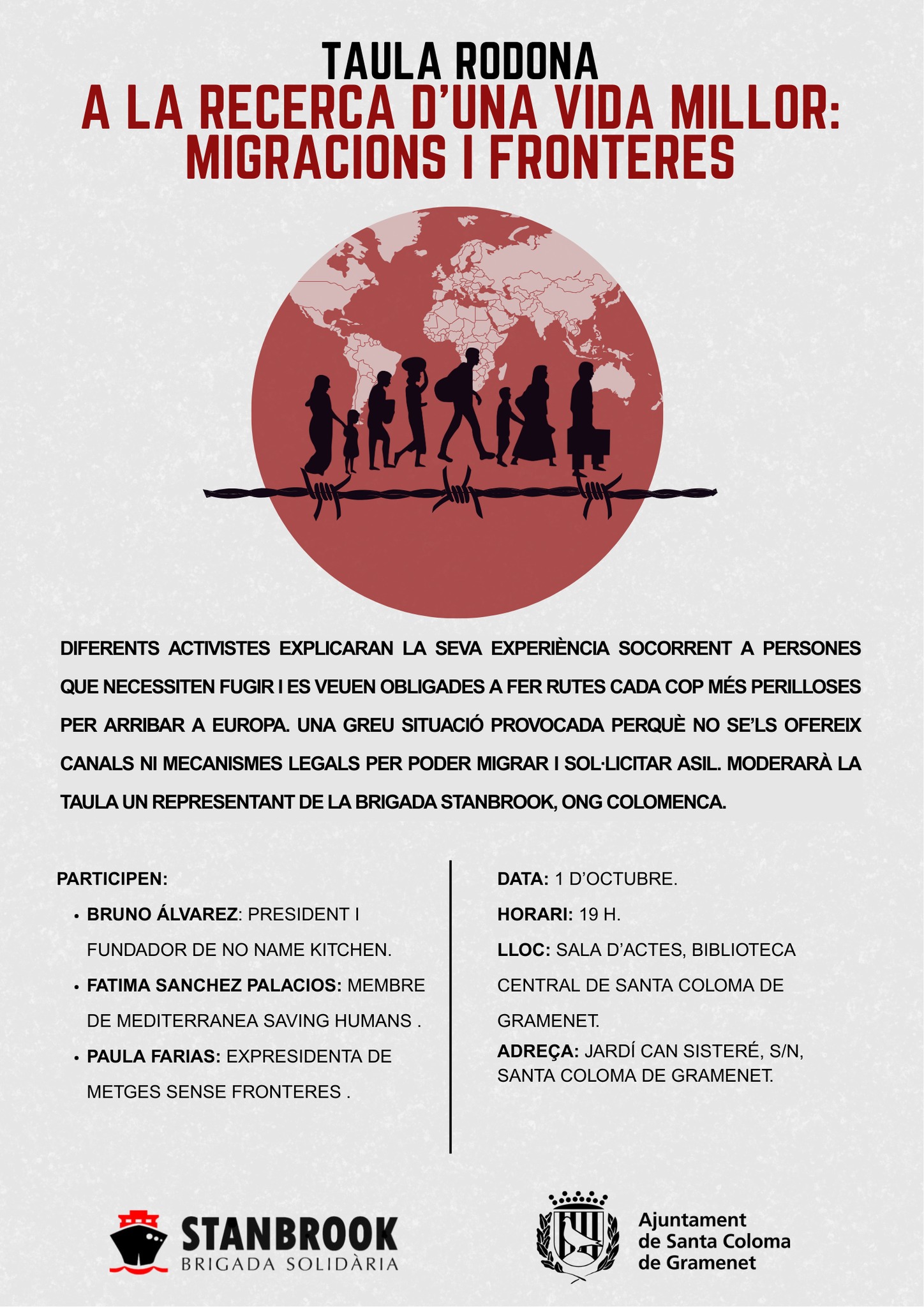 Tres activistes: Bruno Álvarez, president i fundador de No Name Kitchen, Fátima Sánchez Palacios, tripulant de Mediterranea Saving Humans i Paula Farias, expresidenta de Metges Sense Fronteres ens parlaran aquesta tarda de la seva experiència socorrent a persones que necessiten fugir i es veuen obligades a fer rutes cada cop més perilloses per arribar a Europa. Una greu situació provocada perquè no se’ls ofereix canals ni mecanismes legals per poder migrar i sol·licitar asil. Moderarà la taula un representant de la Brigada Stanbrook, ONG colomenca.